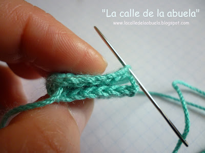 Doblamos de manera que la zona cosida quede en la mitad del rectángulo que se forma y enganchamos el hilo con el ganchillo .